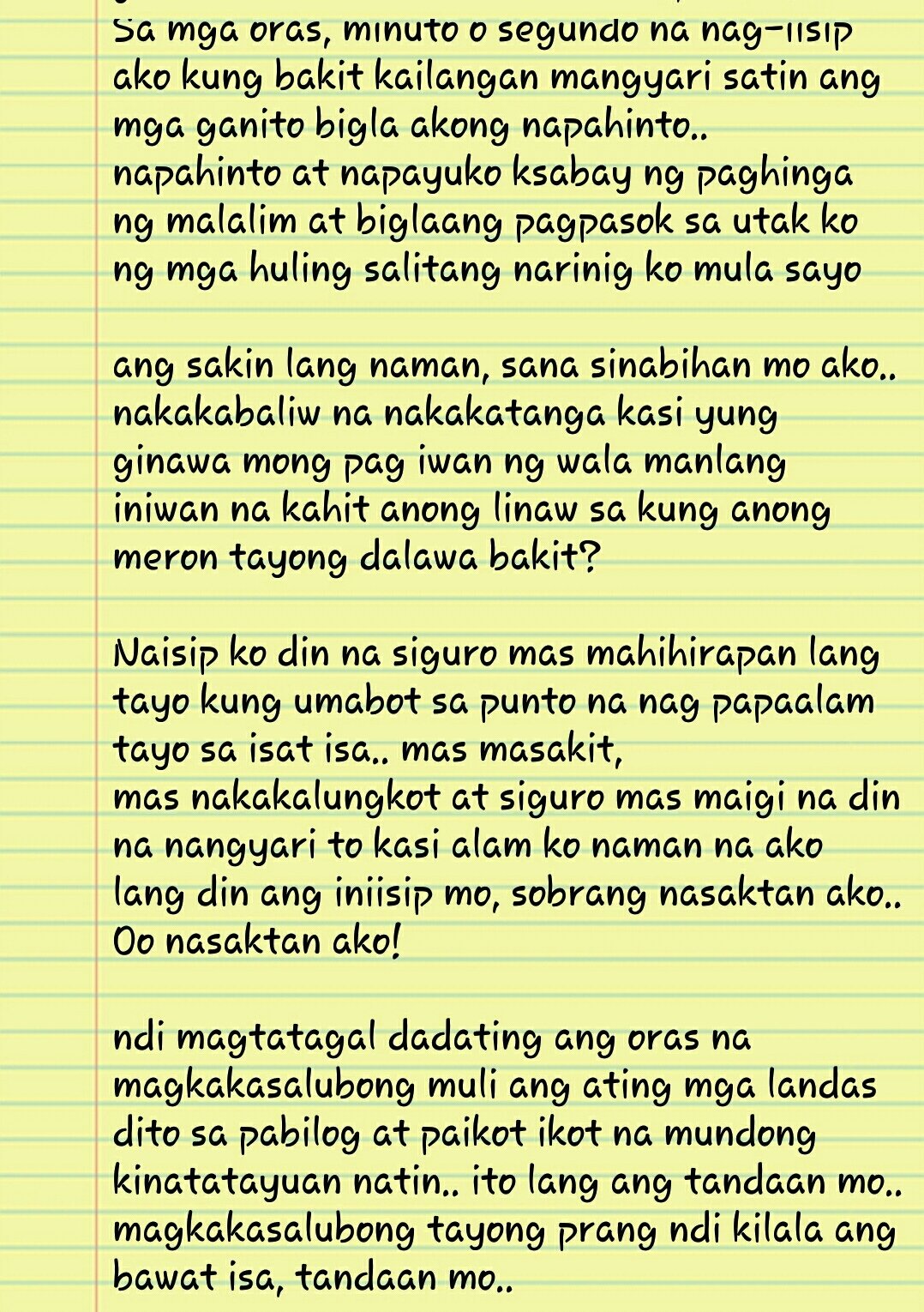 Kung kaya kong umiwas na Di na sana lalapit pa. Ang dami daming bagay na hindi naman kailangan. Madarama mo hanggang bukas.