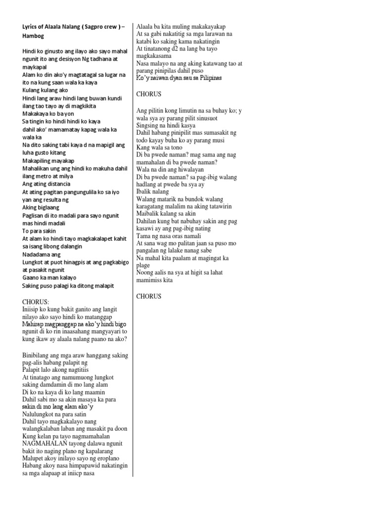 Intro Fm D Hambog ng Sagpro Krew Fm D Una sa lahat A E Gusto kong magpaalam F D A E Lalong lalo ma sa iyo dahil san ako mag punta F D A E Lagi mong hawak ang puso ko Fm D A E Verse 1 Fm D Hindi ko ginusto ang ilayo ako sayo mahal A E Ngunit ito ang desisyon ng tadhana at may kapal Fm D Alam ko din akoy magtatagal sa lugar na to A E. Binibilang ang mga araw hanggang saking pagalis habang palapit ng. Na akoy hindi bigo.